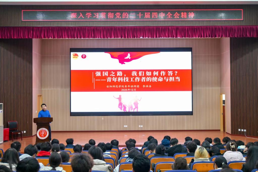 为深入学习贯彻党的二十届四中全会精神,引导青年学子在中国式现代化建设中挺膺担当,12月25日下午,青年讲师团成员李泽浩、郝佳在逸夫楼报告厅为化学化工学院、物理与电气工程学院及建筑工程学院青年学生进行党的二十届四中全会精神主题宣讲。