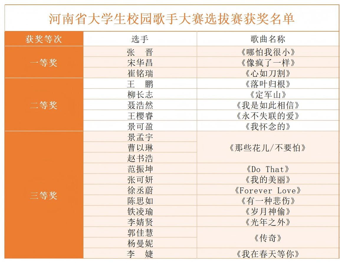 经过激烈角逐,本次大赛共评选出一等奖3名、二等奖5名、三等奖9名,其中,优秀选手将代表学校参加河南省校园歌手大赛,其他选手直接晋级我校第二十届校园歌手大赛决赛。